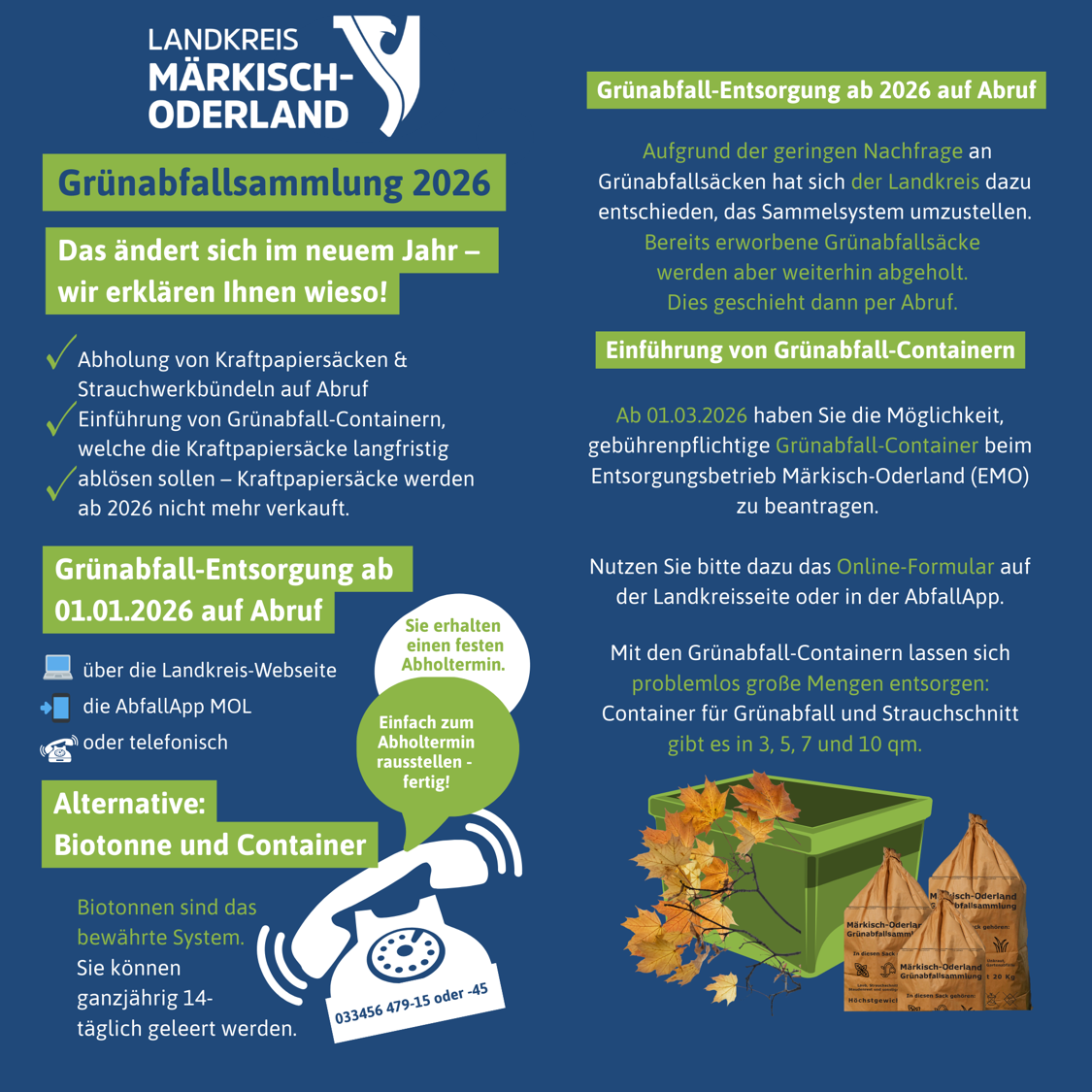 Die Entsorgung der Grünabfälle mittels Kraftpapiersäcken bzw. Banderolen erfolgt ab 2026 ausschließlich individuell, das heißt auf Abruf. Auf diese Änderung weist der Entsorgungsbetrieb Märkisch-Oderland (EMO) hin. Das bedeutet, dass ähnlich wie bei der Sperrmüllentsorgung die Abholung der Grünabfallsäcke und Banderolen vorher telefonisch, online oder über die AbfallApp MOL angemeldet werden muss. Innerhalb von drei Wochen wird dann ein Entsorgungstermin mitgeteilt, zu dem die gefüllten Säcke bzw. Banderolen bereitgestellt werden sollten.
